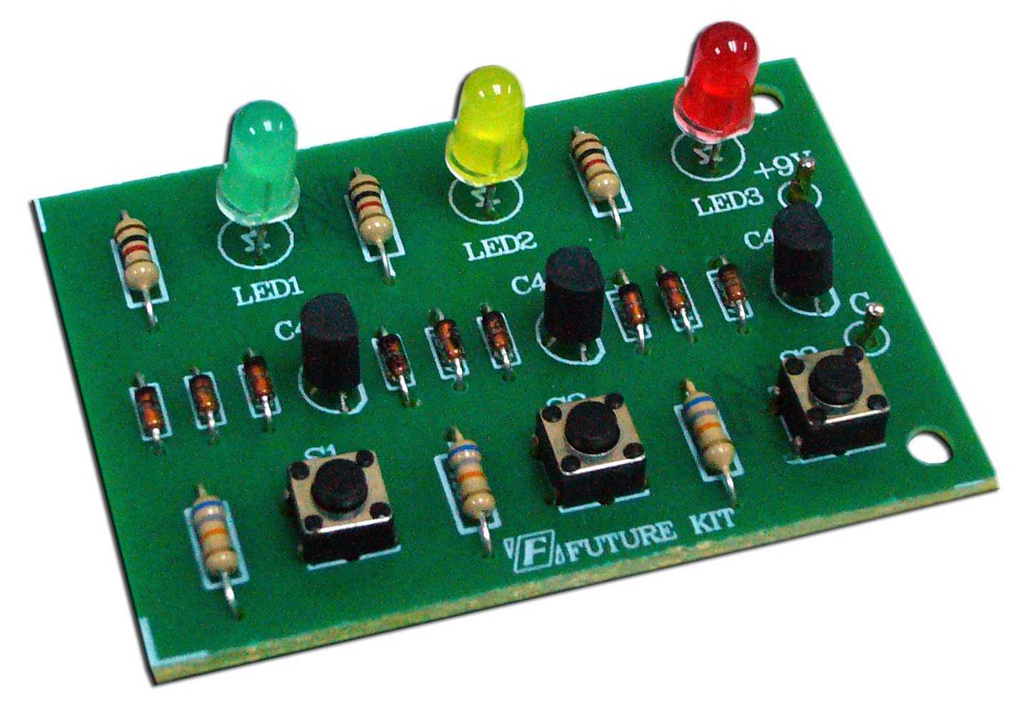 This is an easily assembled circuit that simulates the priority deciding panels in TV game shows. The player who presses his or her switch first, has the right to answer, whilst locking the other two players out. The winning player is identified by the LED associated with that player's switch. The other player's LEDs remain OFF. The switches and LEDs may be wired into remote podiums to provide the same functions.The FK137 is suitable for 2-3 players.