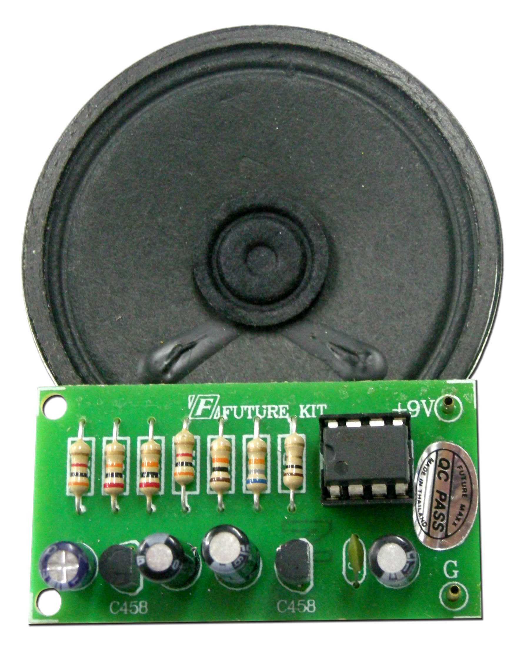 This sound generator circuit combines transistor tone generation and the function of the industry standard LM555 general purpose timing chip to increase the "white noise" component present in train whistles. The ELK00235 is supplied with an 8 Ohm 0.25W speaker and offers a realistic train-whistle sound, making it an ideal sound unit for model train sets.